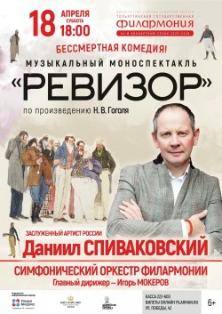Музыкальный моноспектакль по бессмертному произведению Николая Гоголя «Ревизор». Один из самых неординарных артистов театра и кино Даниил Спиваковский представит публике великое творение гения в сопровождении Симфонического оркестра Тольяттинской филармонии под управлением главного дирижера Игоря Мокерова.